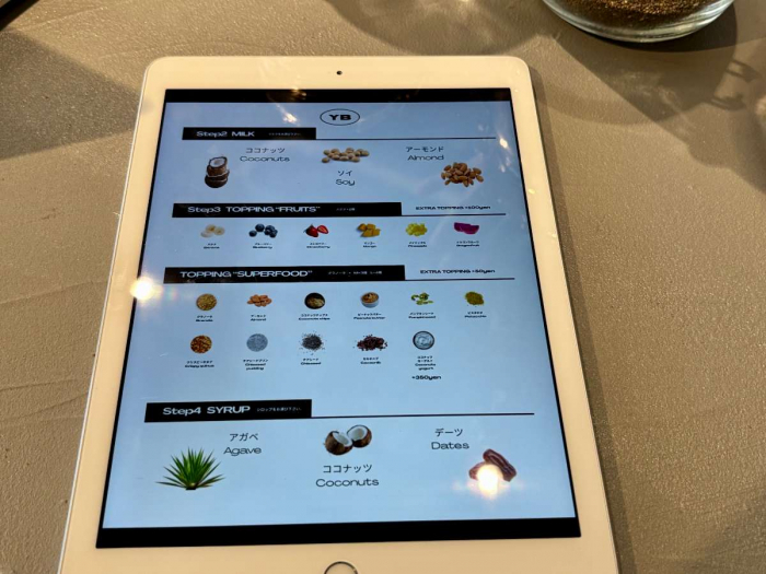 ベースの次は、ミルク、フルーツ、スーパーフード、シロップと好みのトッピングをチョイスしてカスタマイズしていきます。組み合わせるのが難しいという人は、筆者同様オカモトさんオススメでオーダーしてみてください。