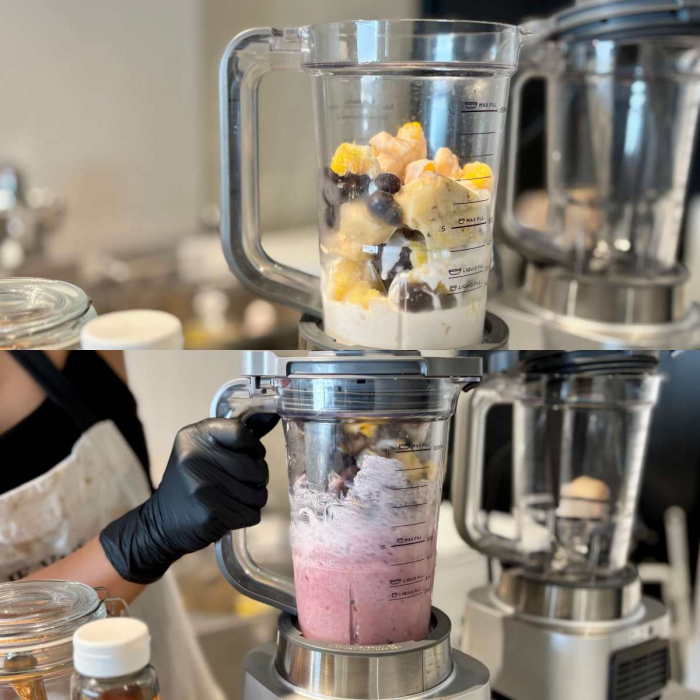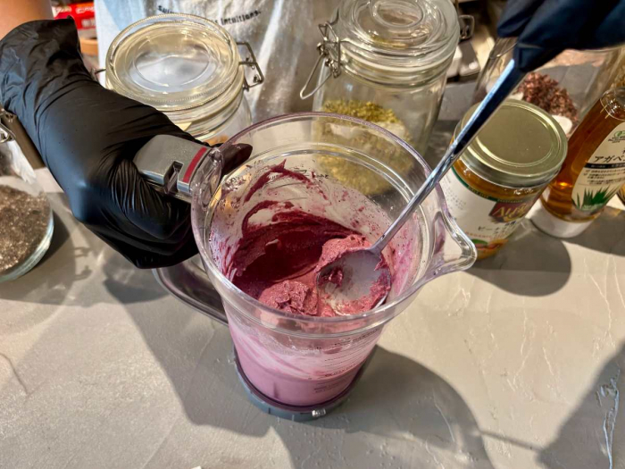 まずはアサイーから。今回は、ミルクにココナッツ、フルーツはストロベリー・ブルーベリー、トッピングはココナッツチップス・チアシードプリン・パンプキンシード、シロップにデーツの組み合わせです。