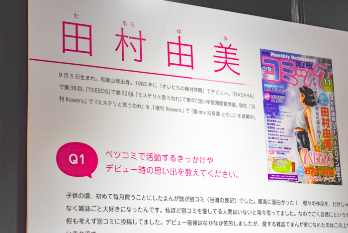 作家インタビューは5名分の大パネルがずらり。ベツコミで活動するきっかけやデビュー当時の思い出、連載当時の秘話、思い入れのあるキャラクターなど、自身の言葉で語られる裏側にはワクワクし、ベツコミ55年の歴史を彩るさまざまな作品にまつわるドキュメンタリーには、何だか胸が熱くなる。