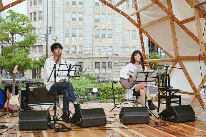 『爆発メルヘンシティ』と『六感音祭』が手掛ける、みなと公園 波止場町緑地エリアでは、DJブースや子どもたちも参加できるマーケットなどが無料エリアとして展開。神戸の街に遊びに来た海外からの観光客も足を止め、イベントの雰囲気を満喫。ライブは“マッシュアップ”しまくりのステージがいくつも展開され、初日には高野寛×澤部渡(スカート)、奇妙礼太郎×高井息吹らが登場。小さな子どもも一緒になって「オー・シャンゼリゼ」を歌ったりと、ピースフルでホリデー感満載の時間が流れていた。