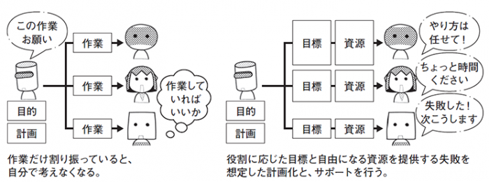 多少失敗しようとも、自分で考えて自分でやったことであれば自分の力にもなりますし、自分のせいで問題が発生したのであれば自分でリカバーしてやろうという気概も生まれます。反対に、考えなくてもいいから言われた通りにだけやっておけ、という指示のもとでは、自分の価値を感じることができず、やる気がなくなります。