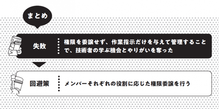 ここが失敗のポイントです。業務に対する権限を委譲せず、作業指示だけを与えて進捗管理することで、技術者の自立性を阻害してしまいます。自分でやり方を考えていないため、失敗から学ぶ経験も得られず、ユニークな課題に自力で対応できない技術者になってしまいます。また業務のやらされ感から、技術者としてのモチベーションも下がり、将来に不安を感じるようになります。