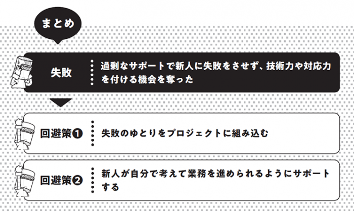 ここが今回の失敗のポイントです。課題に対して直接的な答えを与えることで、新人が自分で考え学ぶ機会を奪ってしまいました。新人のときこそ、様々な失敗をし、失敗から学ぶ機会が必要なのに、誰かの力で成果を肩代わりしてしまうと、実力が得られないまま中堅になってしまいます。即戦力として入ってきたはずなのに、困難な業務をこなすスキルも得られず、経験が足りないため直面したトラブルや課題に対して十分に対応できない「戦力外人材」に育ってしまう可能性があります。