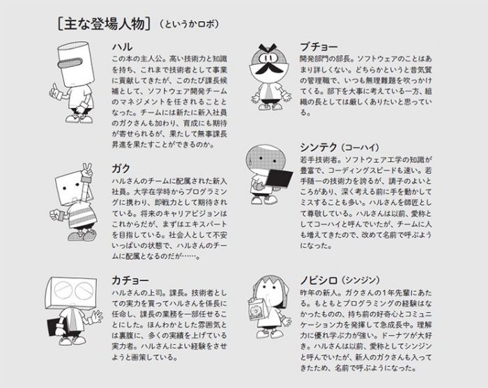 本書ではエンジニアの採用や育成の失敗を追体験できるよう、架空の開発組織とプロジェクトを舞台にしたエピソードを紹介します。また登場人物も明らかにフィクションであるとわかるように、全員ロボットにしています。ただ、それ自体重要な要素ではありませんので、あまり気にせずに読み進めていただければと思います。