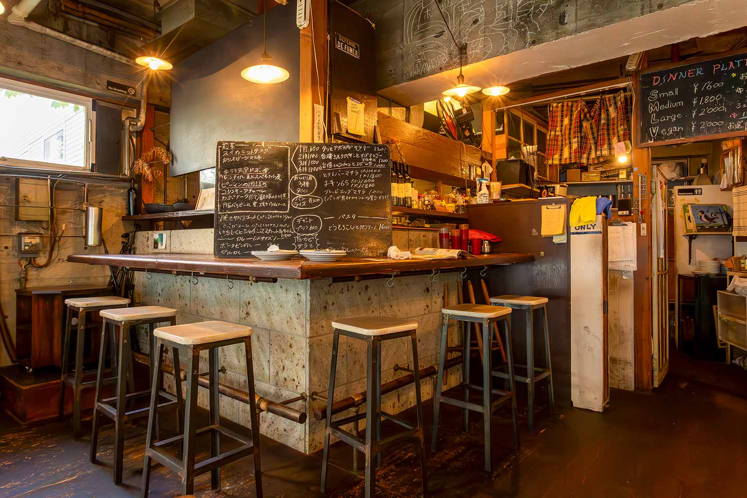 東小金井や高円寺を経て、この地に移ったきっかけは、その前に営業していた料理店に刺激されて。「気取らずに食事ができた」そんな意思を受け継ぎ、多彩な料理を楽しみながらゆっくりと時間を過ごせる場所に。常連さんや近所の人の提案から、自然と音楽イベントが生まれることも。古書の販売もあり。