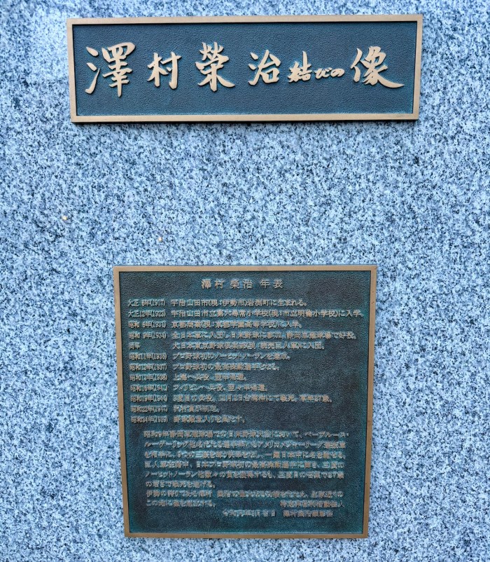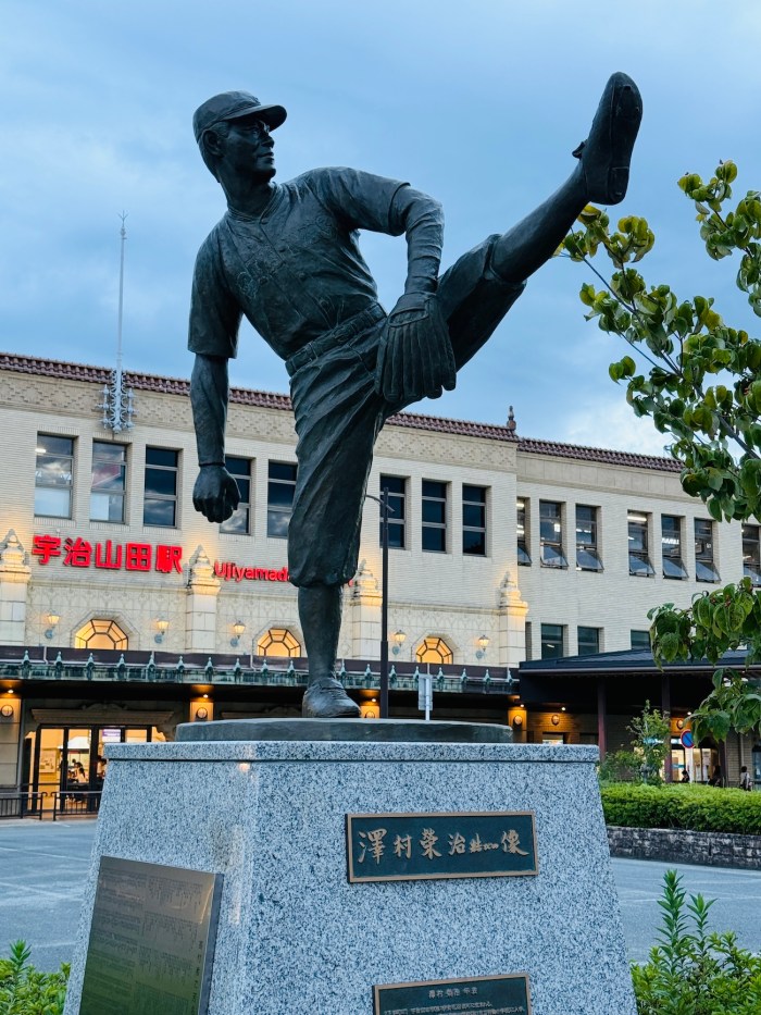 近鉄・宇治山田駅前に立っていたのは、力強く足を振り上げる沢村栄治のブロンズ像。言わずと知れた、日本プロ野球史に名を刻む伝説の投手であり、今も「沢村賞」の名で語り継がれている存在だ。
