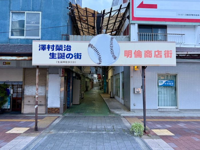 さて、銅像をしばらく眺めてから振り向くと「沢村栄治 生誕の街」なる文字が目に飛び込んできた。明倫商店街の入口から呼ばれている……こうなると足を踏み入れないわけにはいかないだろう。