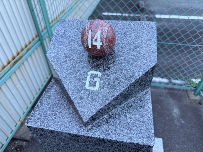 ──と書いてあった。そして石碑の上には沢村栄治の背番号「14」と刻まれたボール。戦時中で軍隊に3度招集され、手りゅう弾の投げすぎで肩を壊した沢村栄治。戦後の1947年に功績が称えられ、巨人の背番号14は初の永久欠番に指定された。