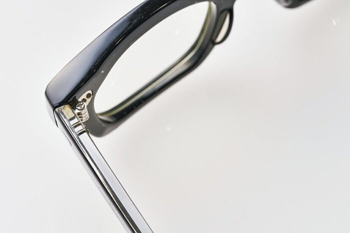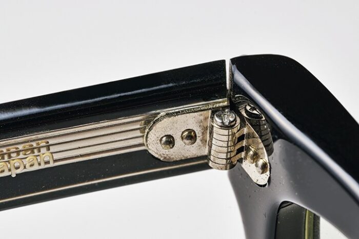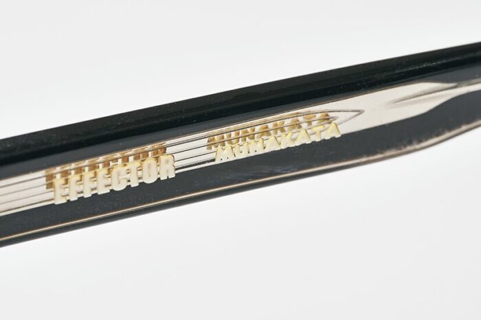 丈夫とされる七枚蝶番を採用し二点鋲で留められる。表側からはソリッドなブラックだが、内側から見るとスケルトンテンプルに飾り芯金が入れられいる。モデル名である「MUNAKATA」の刻印が刻まれる。
