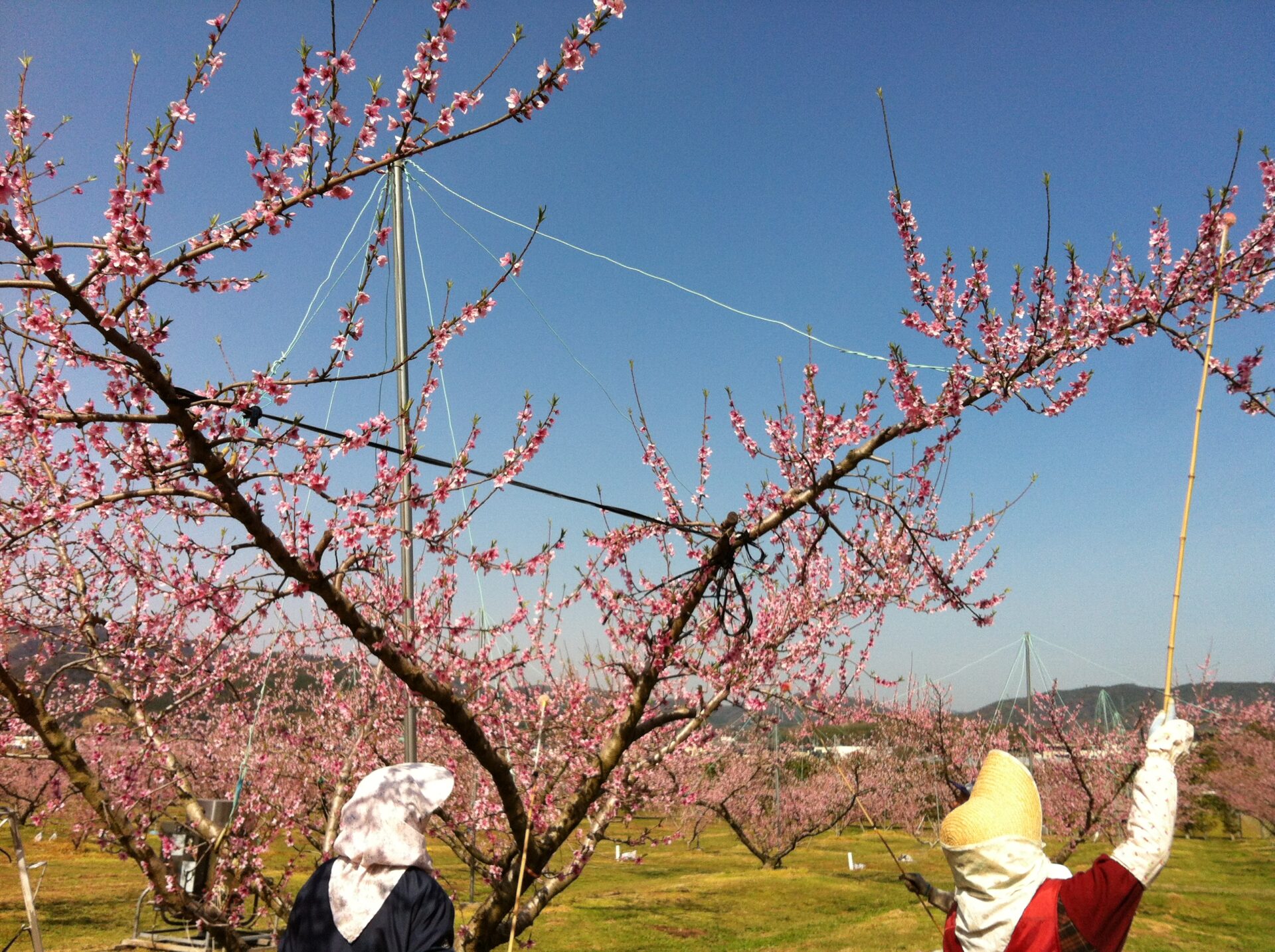 岡山の桃は、枝を低くして歩きながら収穫できるように作られています。地域によっては、1本に500個までと決めて、残りはすべて摘果(間引き)するので大きく育ちます。