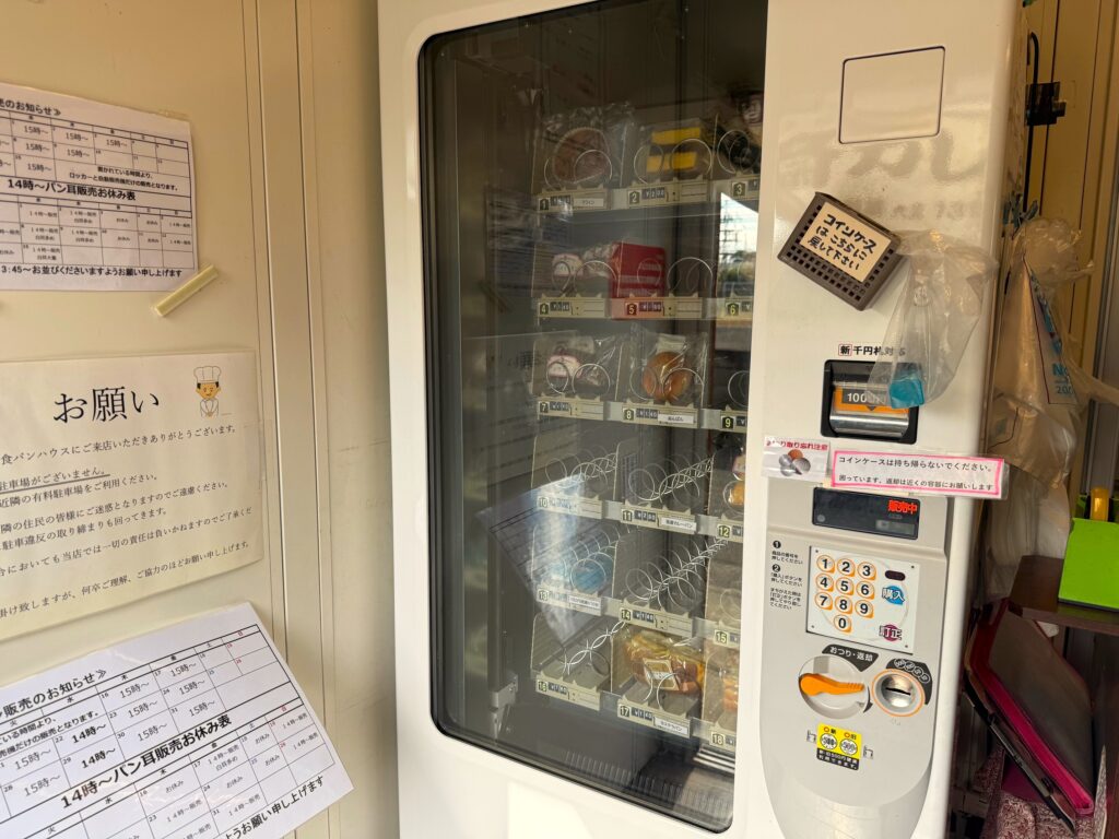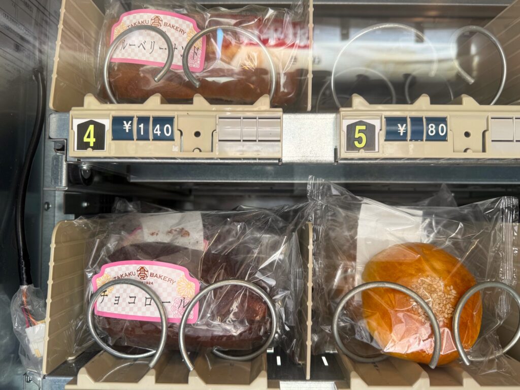中には、アンパンやチョコロール、マフィンなどの菓子パン類が入っていて、こちらもお金を入れてセルフで購入するスタイル。