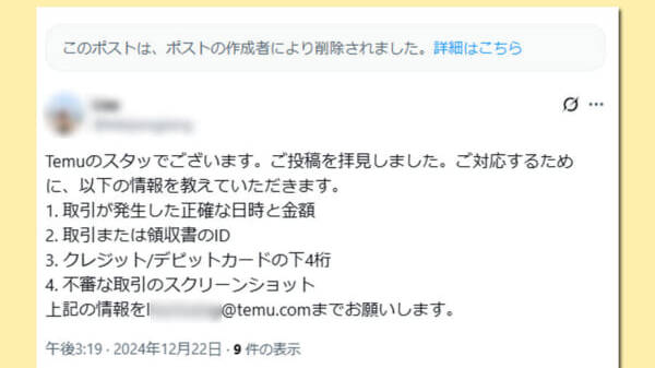 ある日の調査作業の過程で、SNS「X(旧Twitter)」上において、急成長中の越境EC大手「Temu」のサポート担当を名乗る「個人アカウント」を見かけました。