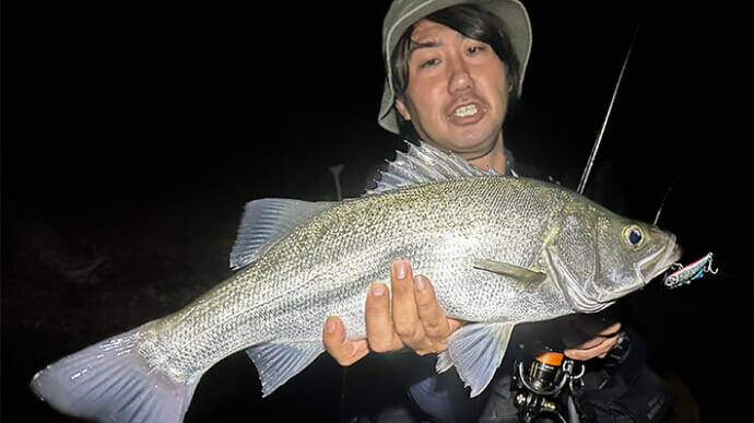 アタるときは1m程巻き上げたところでアタリが出る。アタったら決して止めず、さらにゆっくり巻き続ける。喰い込んだら合わせを入れてフッキング。
