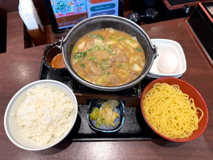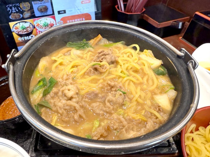 で、目の前に現れた『牛肉玉ラーメン鍋膳』は麺がセパレートで提供されるスタイルで、吉野家としては「煮込みラーメン」もしくは「つけ麺」として召し上がってください、ということらしい。