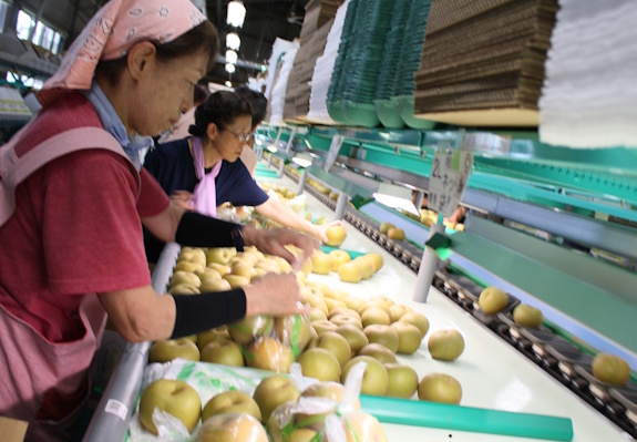 選果場の隣にある直売所では「幸水」が8月下旬まで、その後は「豊水」が9月中旬ごろまで、「あきづき」が9月中旬ごろまで販売する。価格は昨年と同じで、「幸水」が今月16日までが中サイズの3L(8個)で税込み3100円。直売所は期間中無休で、午前9時から午後6時まで。