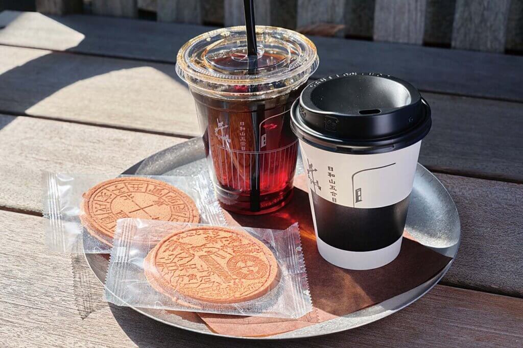 ハンドドリップコーヒー(700円)と、水出しコーヒー(800円)。日和山方角石せんべい一枚付き。