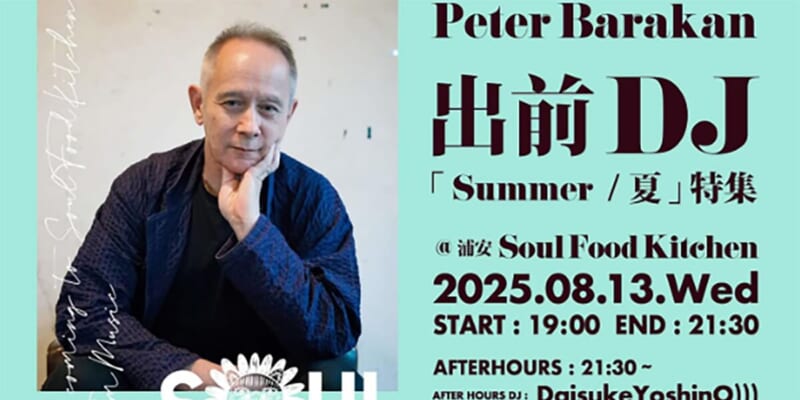 浦安当代島の路地裏にあるミュージックバー”Soul Food Kitchen”は、音楽と料理を楽しむことができるお店です。昨年11月に続いて、8月13日(水)にブロードキャスターであるピーター・バラカンさんを迎え「ピーター・バラカン出前DJ」を開催します。テーマはずばり、「Summer/夏」。夏の夜に気持ち良い音楽を選曲してくださるそうですよ。選曲した曲にまつわるエピソードも聞ける貴重な機会です!