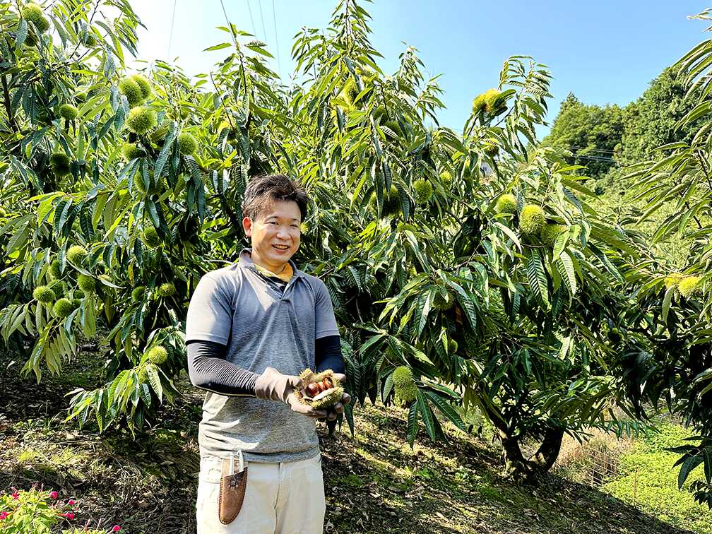 収穫の直前でとても忙しいにも関わらず、やさしい笑顔で応対してくださった栗農家の三瀬 喜平さん。メニークエストが作る栗菓子の原材料である「城川栗」を生産しています。