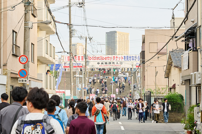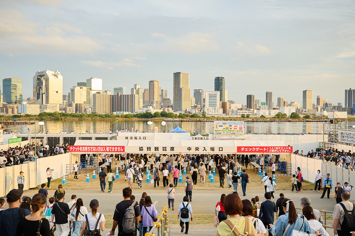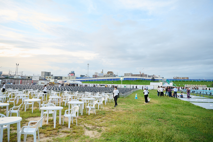 そのまま道なりに進むと河川敷に設けられた協賛席中央階段出入口が見えてくる。エリアに入るためのチケットを提示し、そこからさらに10分ほど西(JP塚本駅側)へ進むとイープラスエリアへ到着!阪急十三駅からはゆっくり歩いて約40分。人の流れや案内板、警備員の誘導があるおかげで迷うことなく辿り着くことができた。