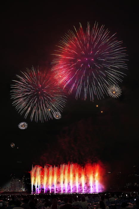 壮大なオープニングに続き、シーン2「進」では、Mrs.GREEAPPLE「ケセラセラ」とYOASOBI「あの夢をなぞって」に合わせ、より進化した技術で観客を楽しませた。水面近くから放射状に打ちあがる花火と、同時にいくつも打ちあがるカラフルな花火で虹を表現したショーは、花火の発色が特に素晴らしかった。