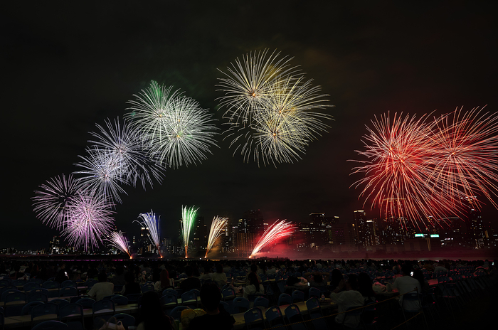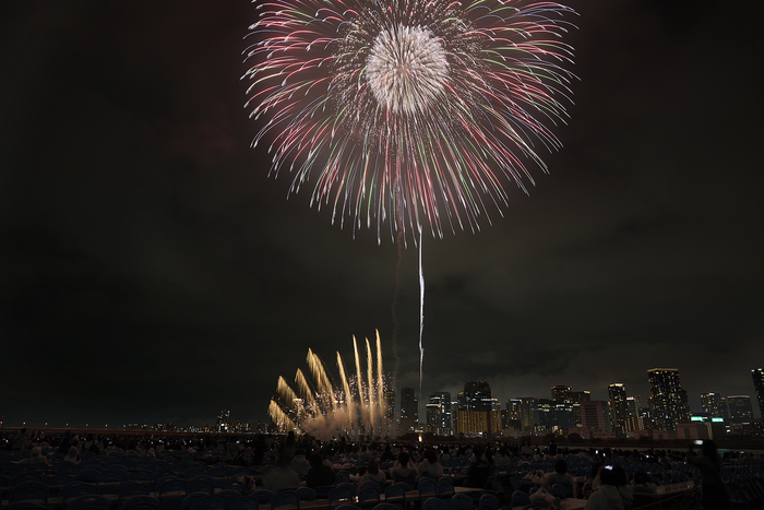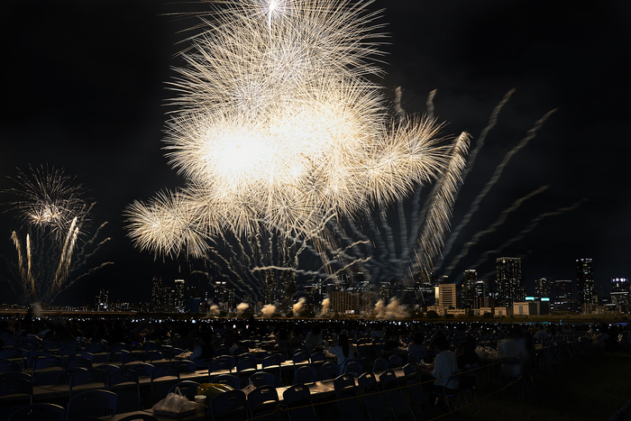 VIPペアシートとサマーベットエリアは川沿いの特等席にあり、淀川や梅田の景色をバックに花火が目の前に迫る、特別な体験が約束されている。また、本格的に花火を撮影したい人のための「写真撮影エリア」も設けられていて、三脚を立てても邪魔にならない場所で、思う存分撮影に集中する花火マニアの人もたくさん。トイレはエリア内に十分な数があるので、打ち上げ直前以外は待つことも少なかった。