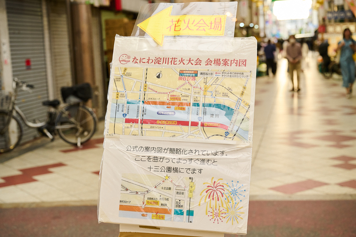 午後4時、この日の平均気温は26度。前日から雨予報が心配されたが、みんなの願いが届いたのか天気は持ちこたえていた。会場へのルートは、JR塚本駅からと阪急十三駅からの2つのルートがあるが、SPICE取材班は阪急十三駅からのルートで向かうことに。駅に着くとホームや駅前は大混雑! 花火大会来場者は西口へ誘導される。