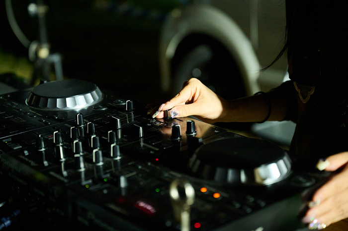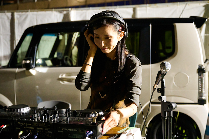 DJブースでは、FM802 DJの深町絵里が、「花火の打ち上げまでは、音楽とフードで楽しんでください!」とウェルカムDJで盛り上げる。「リクエストありましたらどうぞ!」とお客さんのリクエストに応える場面も。