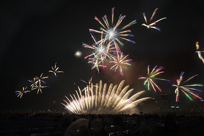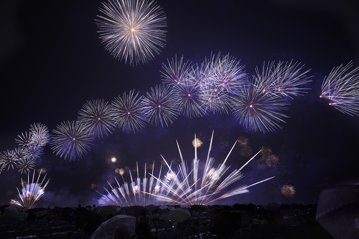 しばらくして、土砂降りの雨がピタっと止み、いよいよグランドフィナーレかと思われたが、雨の影響で数分間の中断となった。このまま中止にならないでほしいとみんなが願う中、エルガー「威風堂々」とともにフィナーレの一発目があがったときには「待っていて良かった」という声が。雨の影響で尺玉10連続は叶わなかったが、高さ300mで打ちあがる直径約30cmの一尺玉は圧巻。たくさんのお客さんが見守る中、無事にグランドフィナーレを迎えることができた。