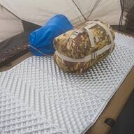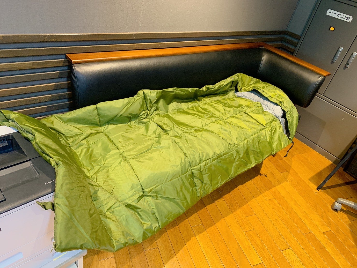 空気を入れて膨らますような、エアマットと寝袋、あるいは、アルミのエマージェンシーシート。