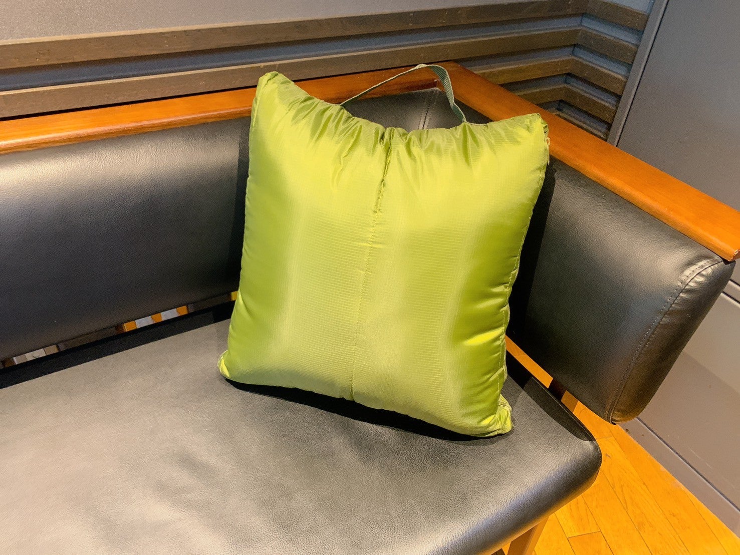避難所には寝る場所があっても寝る道具って基本的にはないんです。なので、この寝袋的な寝具を持ち込むことが大事!大きさが45cm×45cmなので、普段はカバーなどをかけておいてクッションとして使うことも可能!