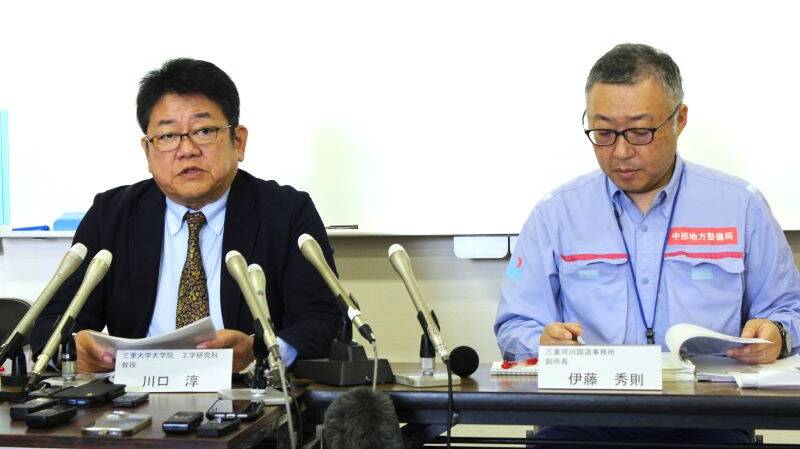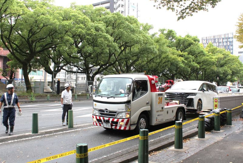 搬出作業は国道1号よりも東側、四日市市総合会館前にある駐車場の出口で午前10時ごろに始まった。レッカー車は2台用意され、1台が出口の下り坂を後退で降りて駐車場内に入り、しばらくして、白いワゴンタイプの乗用車を引いて出口から現れた。9月12日の雨以来17日ぶりの地上だ。