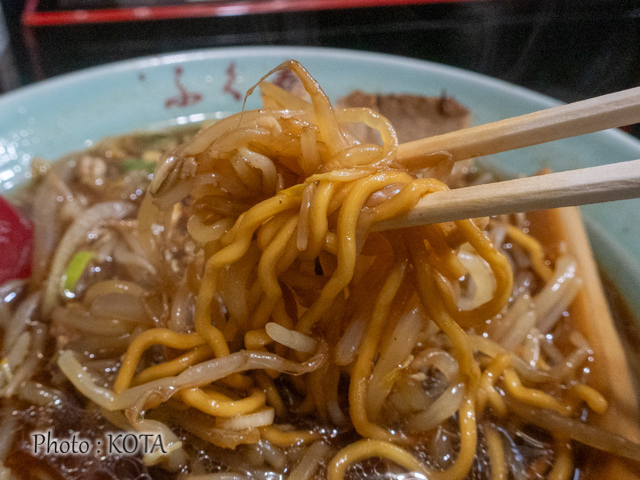 麺はどちらかといえば、やや太めな中太縮れ。おつゆがよく染みた食べ応えありそうな様が食欲をそそる。