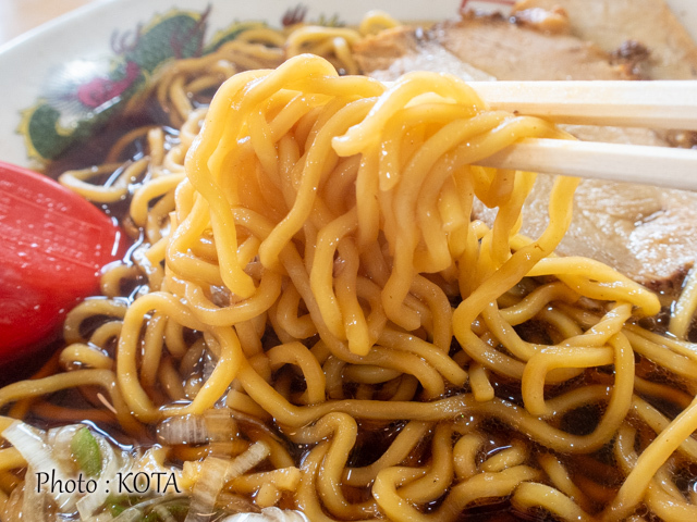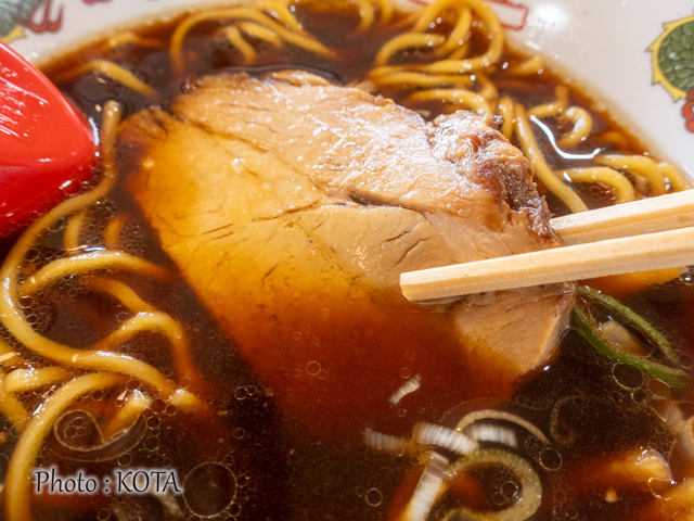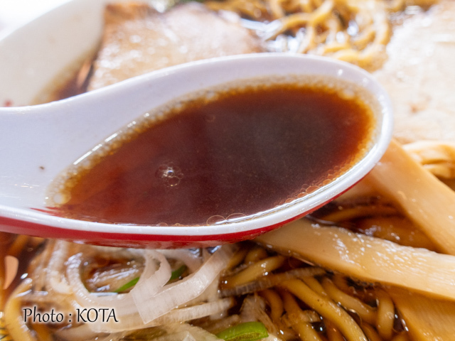 おおっ、濃厚な醤油色。誰が見ても醤油ラーメンという姿に、思わず惚れぼれしてしまう筆者である。