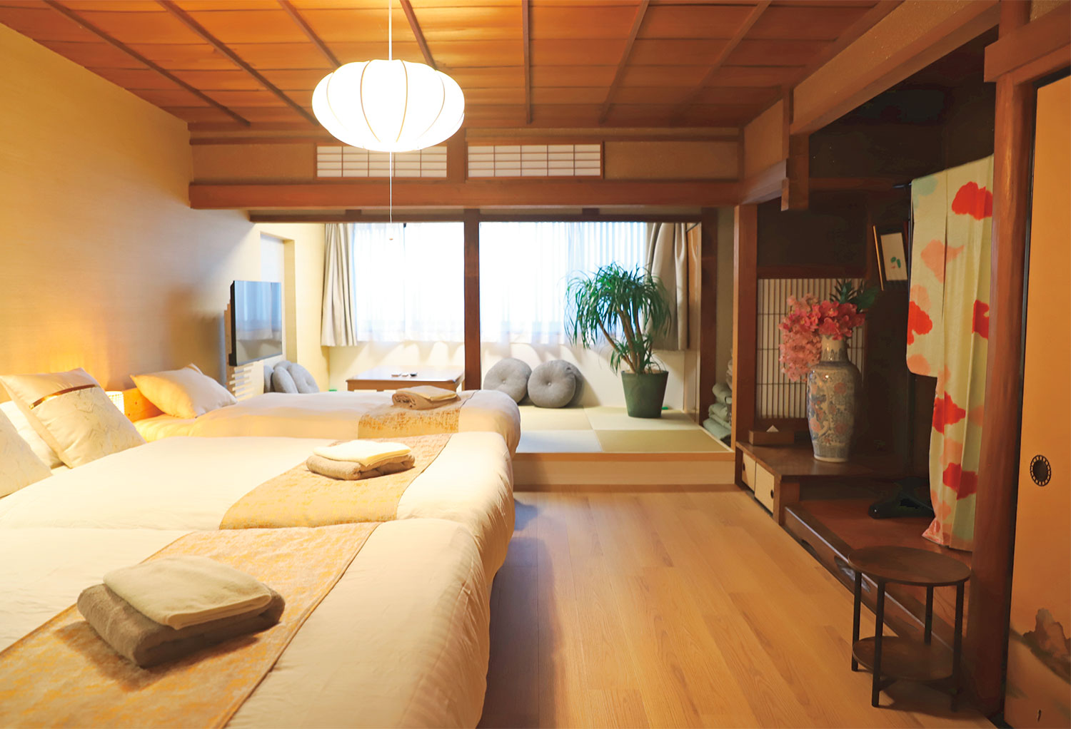 「100周年を目指し、事業を広げようと民泊も始めました」と、1階で生花店『おはなちゃん』を営む4代目の水谷寛之さん。襖や欄間など古きよき風情は残しつつ、トイレ2つとシャワー室を備え、滞在は快適に。