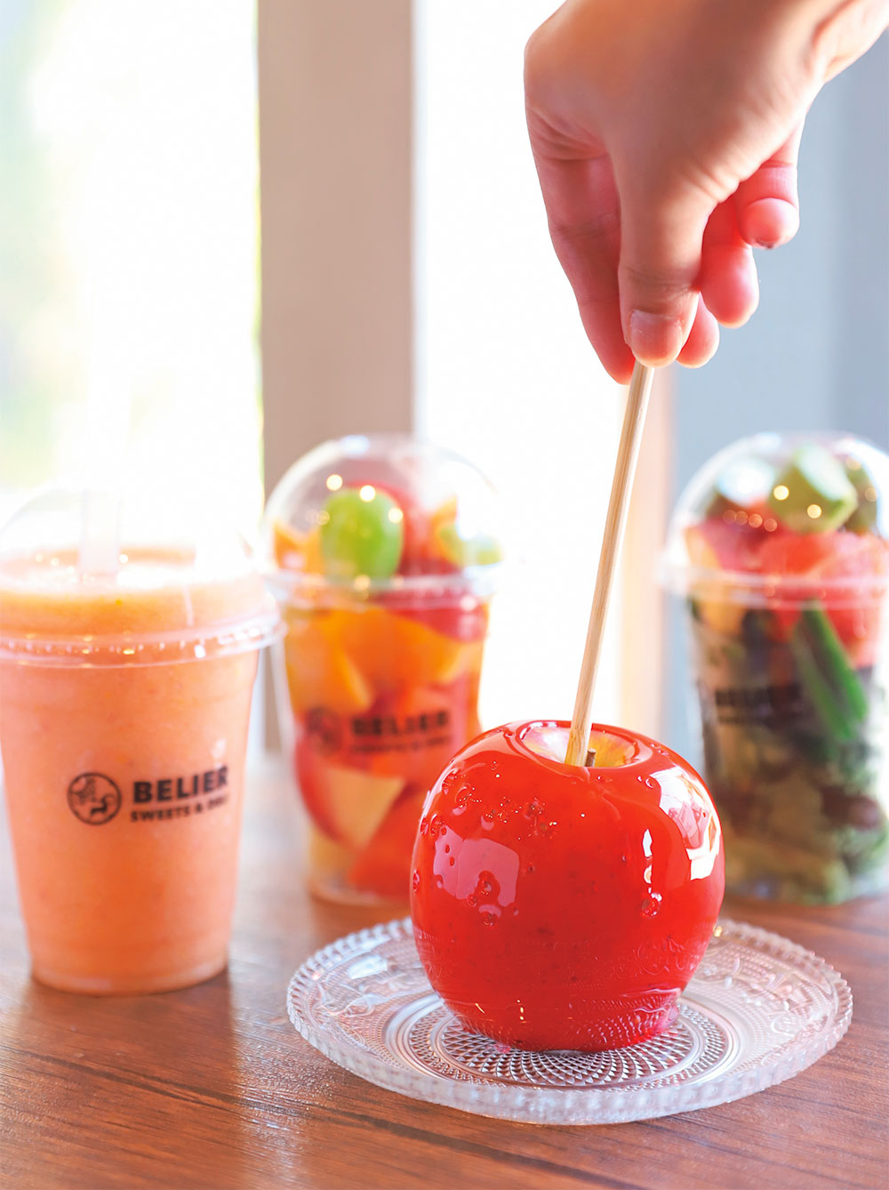 スムージーやケーキ、サンドイッチは、老舗『オオスミフルーツ』が毎日名古屋から仕入れる新鮮果実や野菜たっぷり。おいしくて健康的と評判だ。グラニュー糖は控えめ、果実本来の甘さを生かしたりんご飴500円が一番人気!