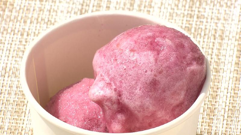 カップに入った紫色のジェラートは、巨峰の実をふんだんに使っています。一口食べると、甘みだけでなく酸味もしっかりと感じられる本格的な味わいです。