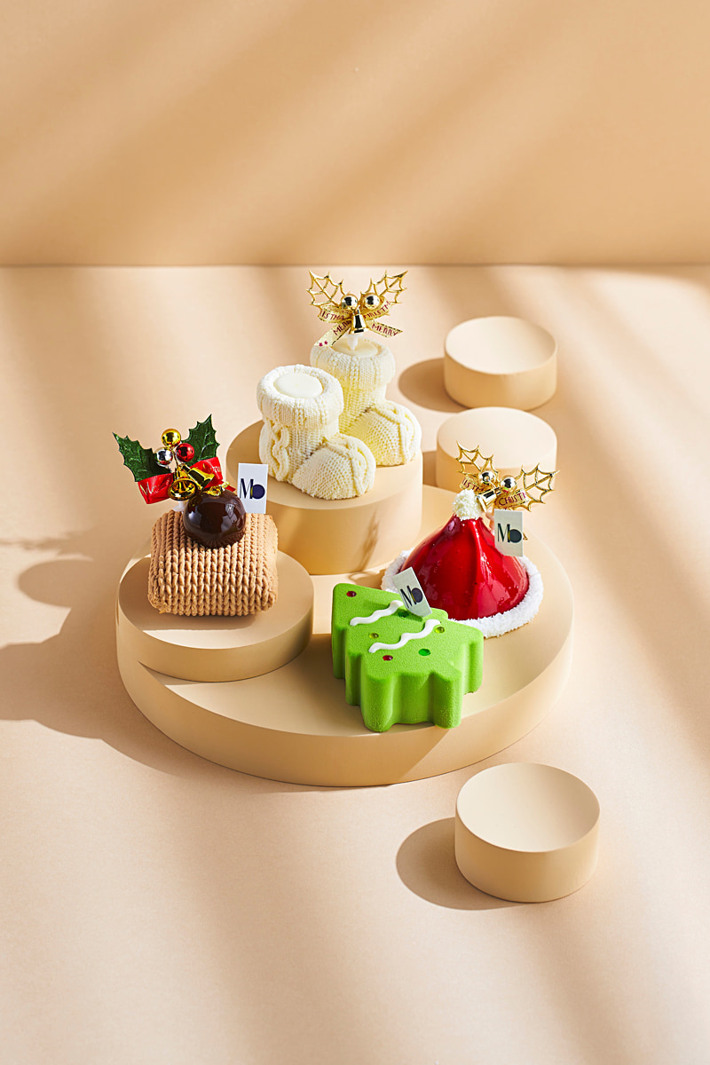 大きなオーナメントの飾りが印象的。街中に漂うお菓子のスパイスの香りをチョコレートムースに移したクローブやジュニパーベリーなどの香りで表現しています。ベリーコンフィの赤、バニラシャンティの白、ピスタチオクリームの緑を中に忍ばせた、切り分けた瞬間のサプライズも楽しめるクリスマスケーキです。