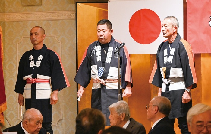 その消防組織ができて100年目を迎えた中原消防団。節目を祝おうと会場には歴代の団長をはじめ、来賓、関係機関、現役の団員らが式典に出席した。冒頭、登壇した現団長で第20代の鹿島団長は「連綿と続いている中原消防団を諸先輩方につないでいただけたことに感謝している」と謝辞を述べた。続けて、年々中原区の都市化が進み、消防団に課された役割が多岐にわたることに言及し、「火災発生時の後方支援をはじめとした大規模災害に備えた知識の向上、家族を守ることにつながる応急救護技術の習得などが必要とされている。100周年を契機にさらなる消防団活動の充実を図っていきたい」と今後に向けた抱負を語った。