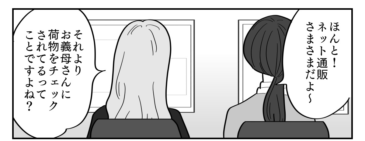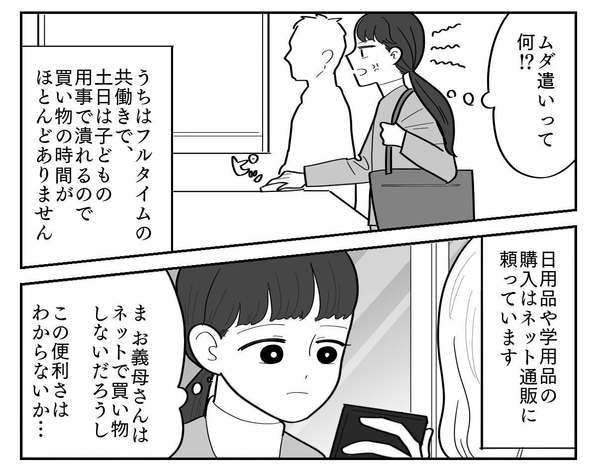 忙しい毎日、ネット通販にはとても助けてもらっています。かさばるものを定期的にまとめ買いして届けてもらったり、子どもたちに必要なものを注文したり……。平日の仕事帰りは時間がないし、週末も子どものスポーツの練習や試合の付き添いなどで忙しくしています。もはやネット通販がない生活なんて想像できません。 でもまさか届いた荷物を義母に監視されているとは思いませんでした。こちらはムダ遣いどころか、生活に最低限必要なものを買っているのに……。義母にこちらの事情を理解してほしいとは言いませんが、いちいち荷物をチェックしようとするのは勘弁してほしいなと思うのでした。