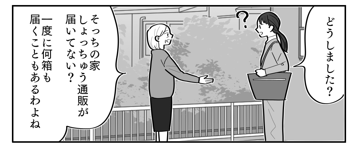私(サヨ)は夫のカズキと小中学生の子どもたちと4人暮らし。夫婦共働きで毎日慌ただしく過ごしています。そんな私たちの日々の生活を支えるのがネット通販! 注文してすぐ届く便利さにすっかり手放せなくなり、日用品などはほとんどネットで買っています。配達指定は毎回「置き配」で、わが家の玄関前に置いていってもらっているのですが……。最近はどうやらうちの斜め向かいに住む義母に、その荷物をチェックされているようなのです。