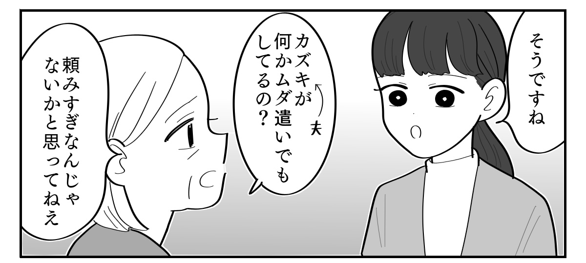 ある朝、出勤しようとすると斜め向かいに住む義母が外に出ていました。何かを言いたそうな義母に私は足を止めます。けれど「ムダ遣い」「頼みすぎ」と言われてモヤモヤ……。時間もないし面倒なので早々に切り上げました。