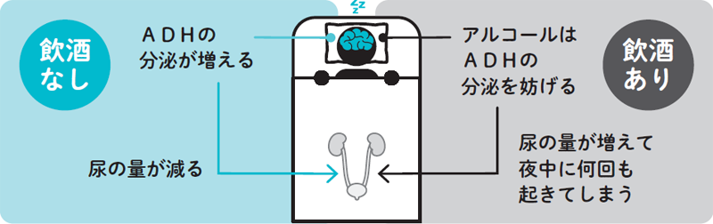 普段は、脳の下垂体後葉から抗利尿ホルモン(ADH)が分泌されることで尿量を減らし、体内の水分バランスを保ちます。特に睡眠中は、ADHの分泌が増えて尿量が減り、朝までトイレに行かずに済みます。しかし、お酒を飲むとアルコールによってADHの分泌が妨げられ、尿量が増加。夜中にトイレに起きる回数も増えるのです。