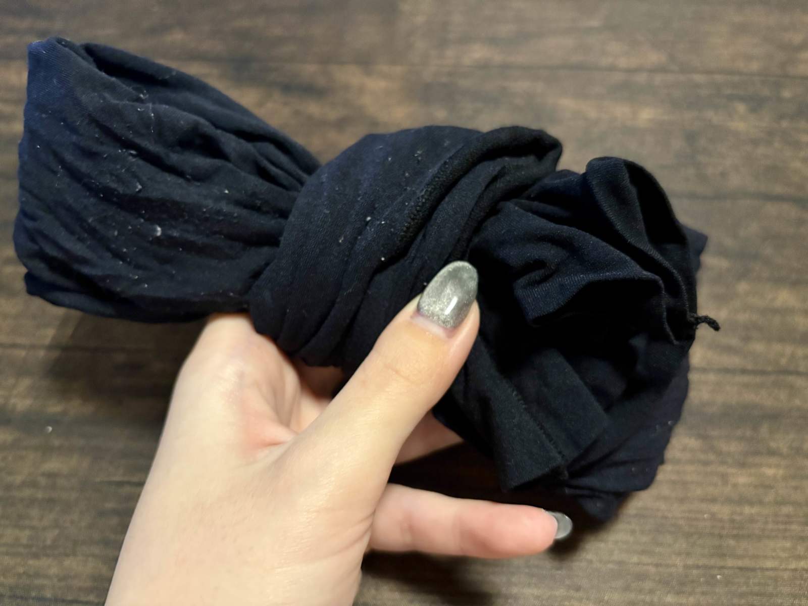 完成したストッキングのリボン型掃除アイテムは、窓拭きはもちろん、テレビ裏や棚の上、照明カバーなどのホコリ取りにも活躍します。タイツやレギンスでも同じように作れますが、デニールの低いタイプは折る回数を増やすと、ボリュームが出てます。
