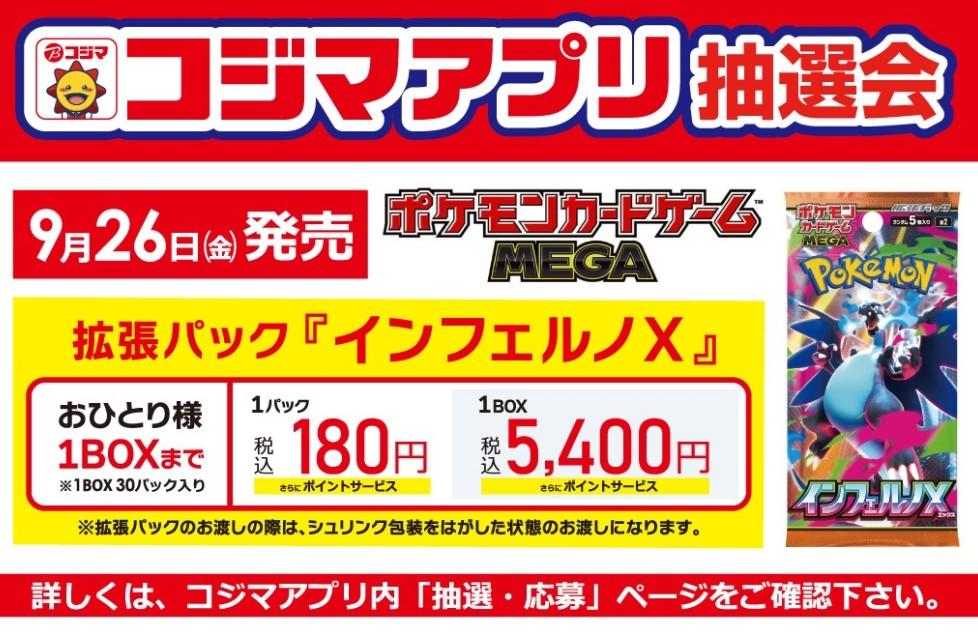 コジマアプリは2025年9月12日から19日まで、ポケモンカードゲーム MEGA 拡張パック「インフェルノX」の抽選販売を実施しています。