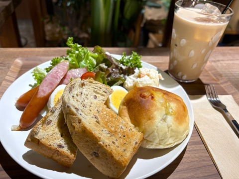 内容がわかりやすいように、俯瞰でも撮ってみました。お願いしたパン2種、ゆで卵、ポテトサラダ、ソーセージ、そしてグリーンサラダ+プチトマト。理想的なモーニングディッシュです。
