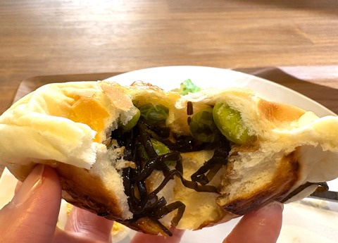気になっていたプチパンを割ってみると、中には塩こんぶと枝豆が予想以上にぎっしり!ふんわりパンで包まれた、程よい塩味のこんぶ×枝豆の食感のコラボが最高です。