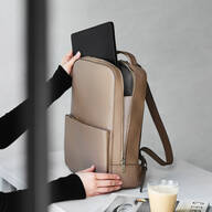 ナイロン×牛革という斬新な組み合わせが秋のコーデを引き締めます。