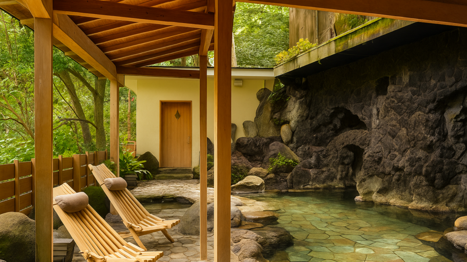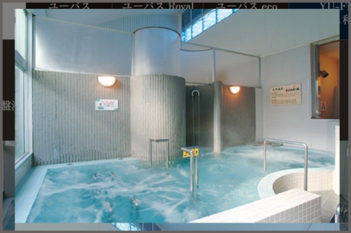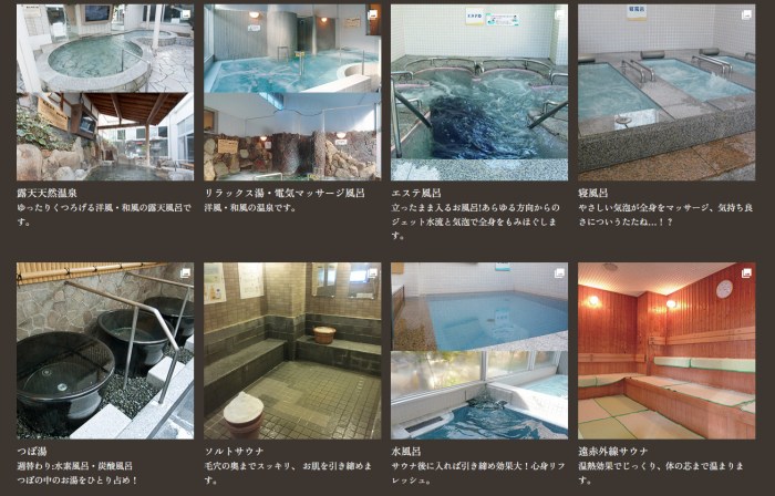施設には天然の露天風呂に寝風呂・つぼ湯・エステ風呂、それに遠赤外線サウナ・ソルトサウナ・岩盤浴などがある。