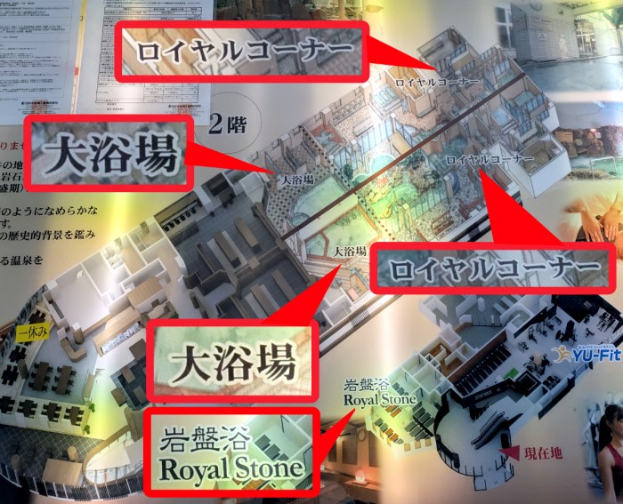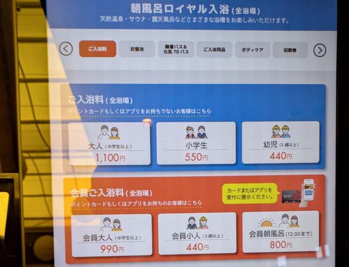早速入館しようと券売機を見ると、画面上部に「朝風呂ロイヤル入浴(全浴場)」とあった。あとから気づいたのだが、入浴料は2種類あって、全浴場が使える「ロイヤル入浴」と、もう1つは「大浴場入浴」である。