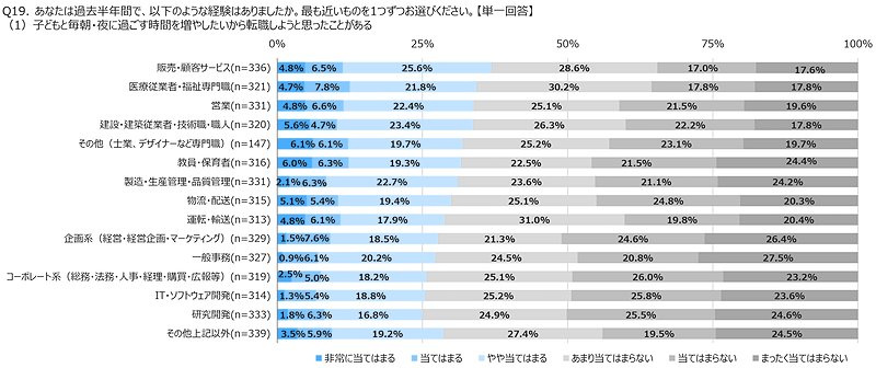 また、「子供との時間を確保するために転職を検討したことがある」と回答した割合は約30%であり、職種別では25〜37%の範囲に収まっていた。全ての職種において3~4人に1人が転職を検討していたことになる。